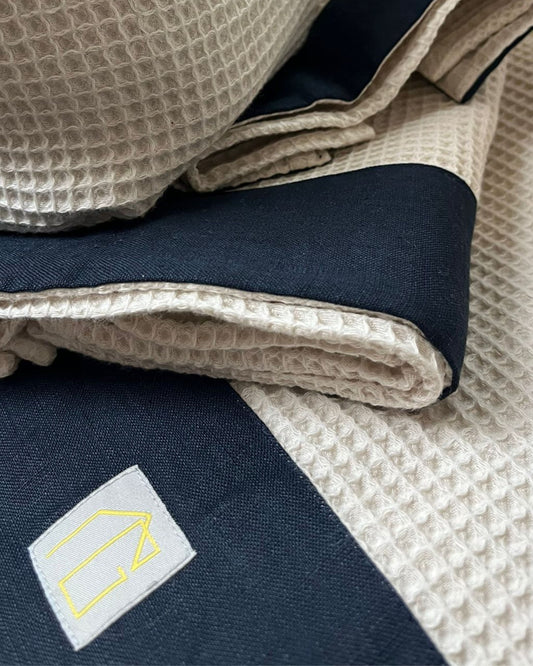 SET BAGNO 3 ASCIUGAMANI IN NIDO D'APE PANNA CON BORDATURA IN LINO BLU